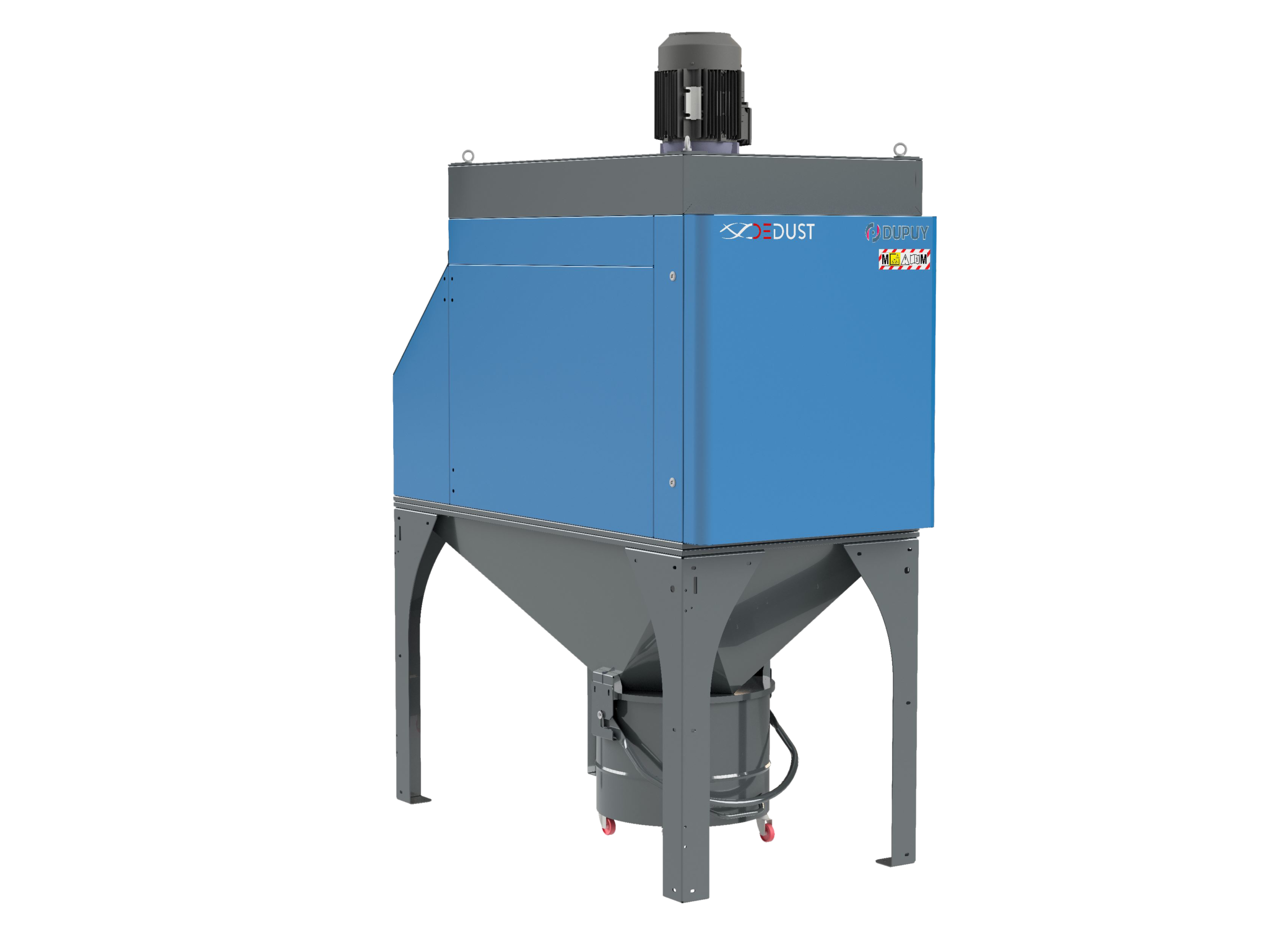 Alle DEDUST ELF Modelle sind mit einem komplett lackierten Stahlrahmen ausgestattet und verwenden antistatische Polyester-Patronenfilter der Klasse M, die der IEC 60335-2-69 entsprechen. Das automatische PN-Filterreinigungssystem sorgt für eine konstante Kontrolle der Verstopfung und hält die hohe Saugleistung über die Zeit aufrecht.
