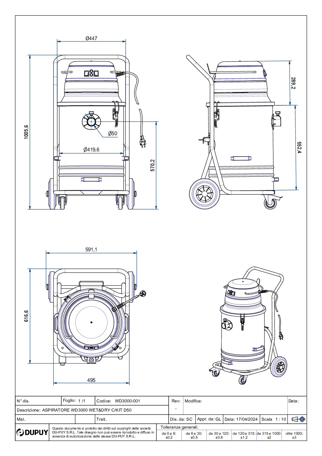 Il modello WD 3000, appartenente al range di bidoni aspiratutto professionali di Dupuy, è un aspiratore industriale adatto per solidi e liquidi, dotato di due motori by-pass monofase.