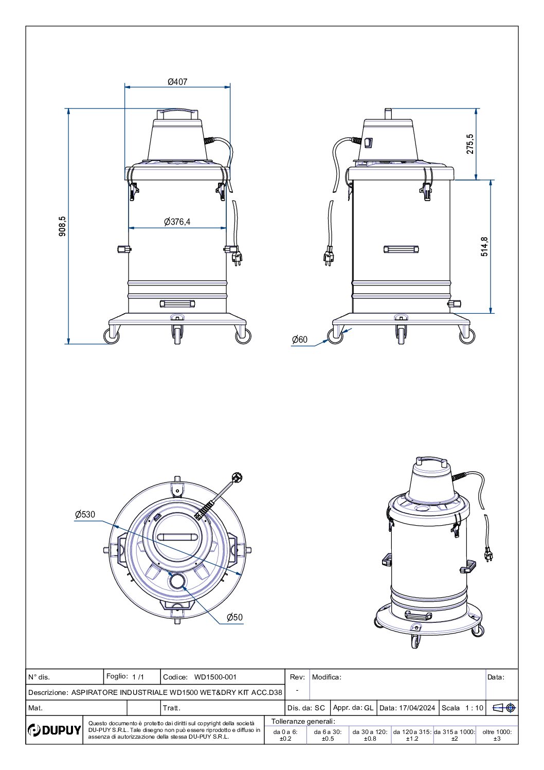 Compatto, leggero e potente, l’aspiratore WD1500, appartenente alla famiglia dei bidoni aspiratutto di Dupuy,  è adatto all’aspirazione di polveri o liquidi grazie a un kit polveri e un kit liquidi, entrambi compresi nella dotazione standard. Il kit per polveri è costituito da un filtro in poliestere/nylon. Il kit per liquidi è composto di un galleggiante per arresto automatico dell’aspirazione, a contenitore pieno.